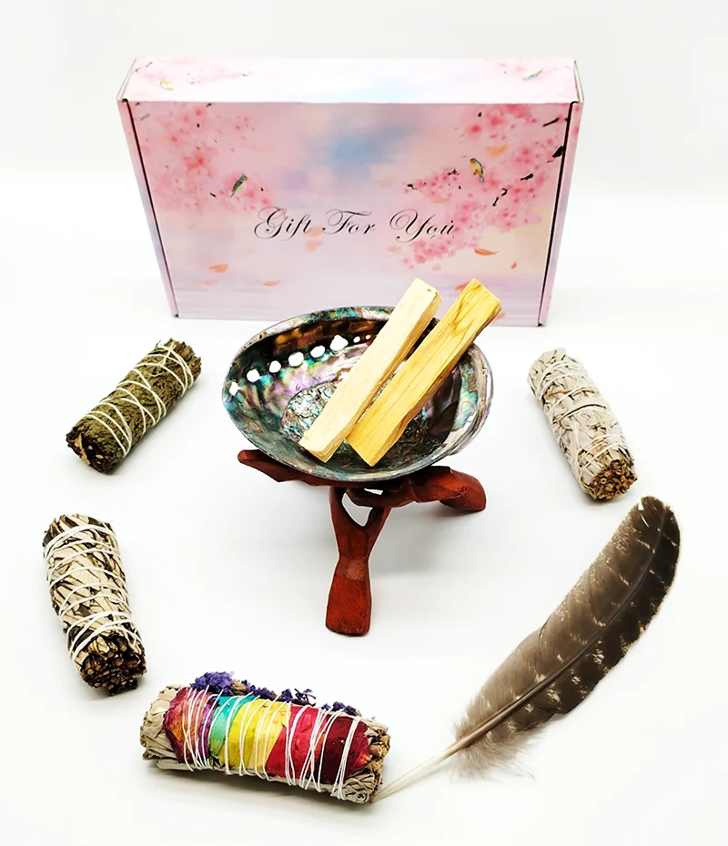 • KIT DE LIMPIEZA ENERGÉTICA: 4 manojos de salvia con una concha de abulón, 2 palos santos, pluma y soporte trípode. Este es el kit perfecto para quienes se inician en la limpieza energética con salvia o tienen experiencia en este tipo de prácticas.
